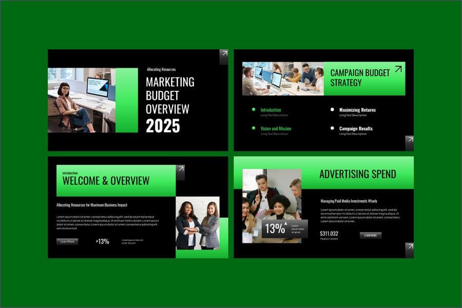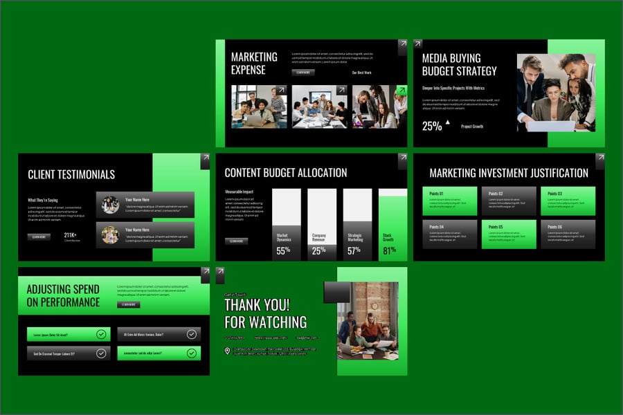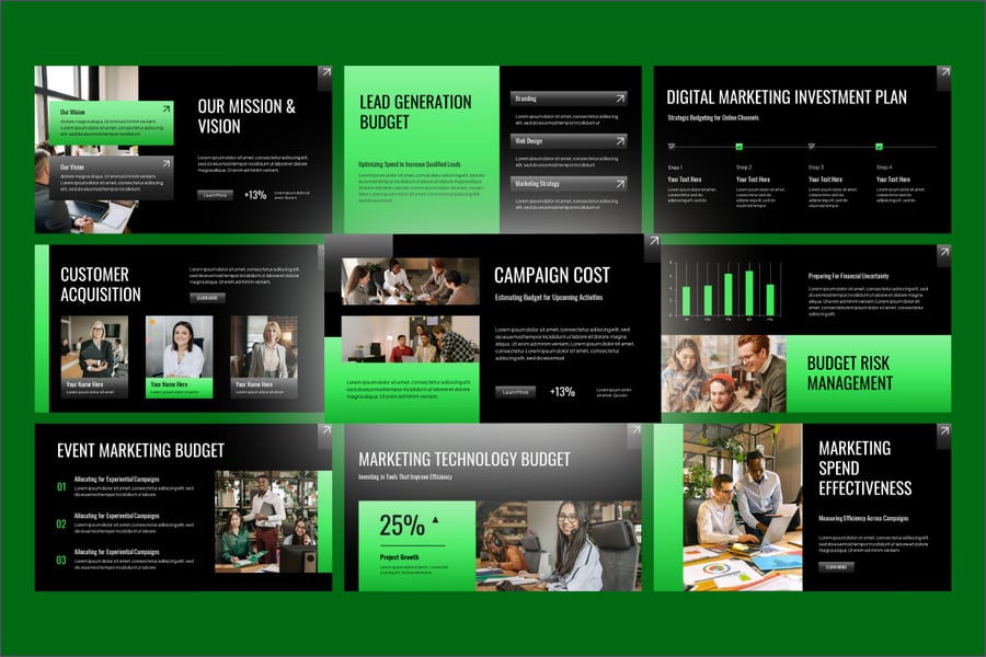 无论您是向利益相关者进行项目汇报、汇报月度营销费用,还是规划年度营销活动,此模板都能将复杂的数字简化为易于理解的可视化图表。现代化的布局、条理清晰的数据幻灯片和可编辑的图表,让您能够自信且专业地传达营销财务计划。它非常适合用于数字营销策略演示、媒体策划、广告预算报告、营销分析报告和活动绩效评估。