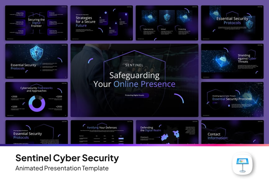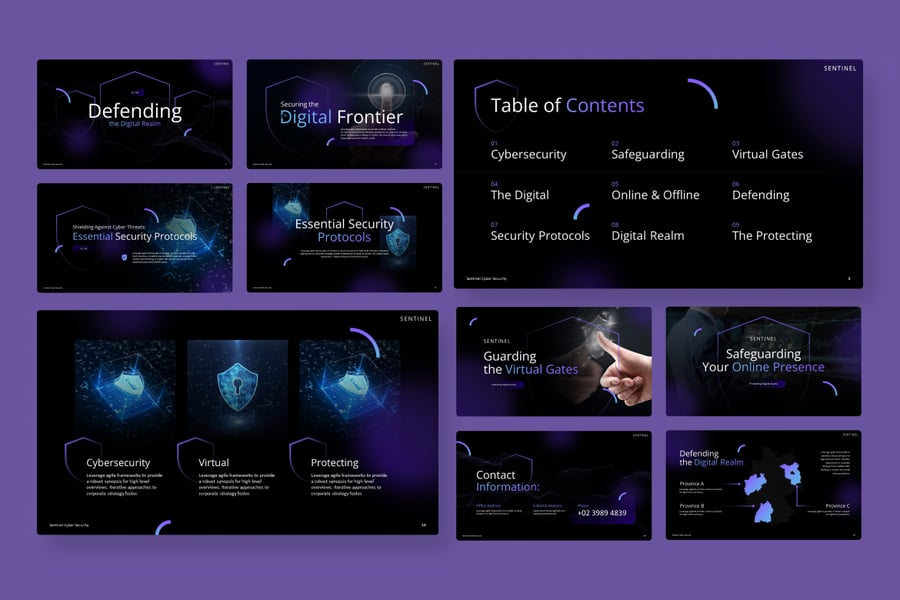 Sentinel网络安全技术演示模板是一款以网络安全和数字技术为主题的演示模板,专为IT公司、科技初创企业、软件安全专家和网络系统顾问设计。它适用于安全简报、产品演示、防护系统技术、企业技术方案以及线上研讨会或会议。