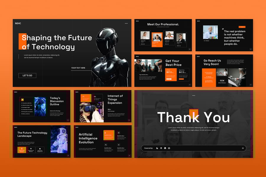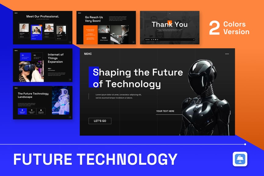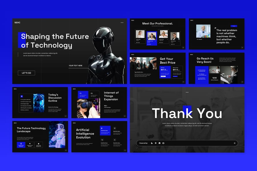 这款面向未来的科技演示模板采用引人注目的深色模式美学设计,助您探索创新和新兴科技趋势,吸引观众的目光。其现代专业的设计风格,能够帮助科技领袖和创新者以极具视觉冲击力的方式展示人工智能发展、数字化转型计划和前沿解决方案,与前瞻性的内容相得益彰。