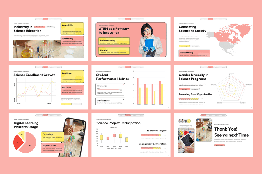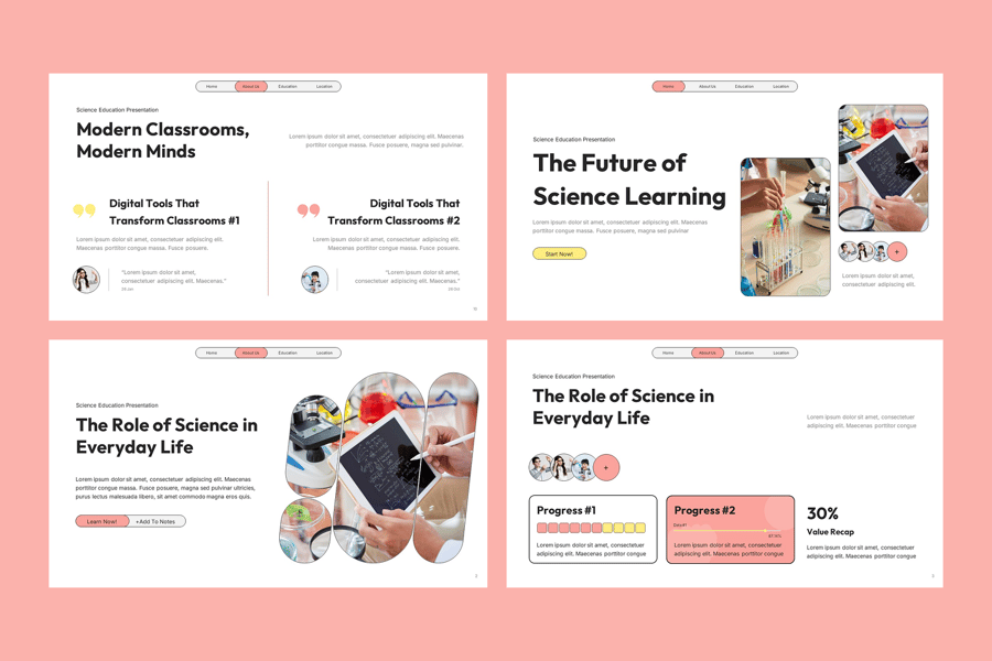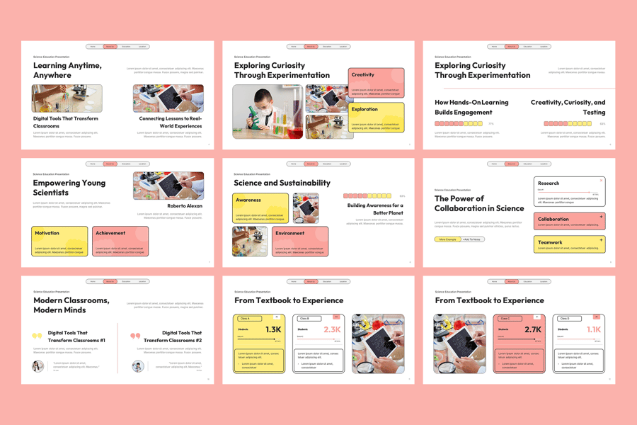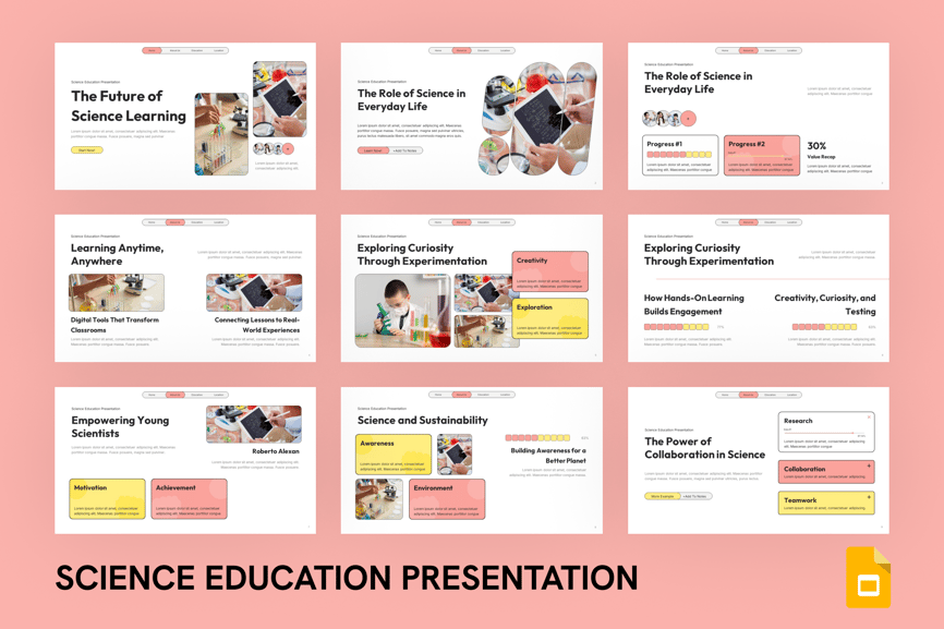 使用这款科学教育谷歌幻灯片演示模板,清晰生动地呈现科学学习内容。该模板专为教师、教育工作者、学生和学术机构设计,提供结构化的布局,用于讲解物理、化学、生物和地球科学等学科的科学概念、理论、实验、观察结果和学习目标,使课程更具互动性,更易于理解。