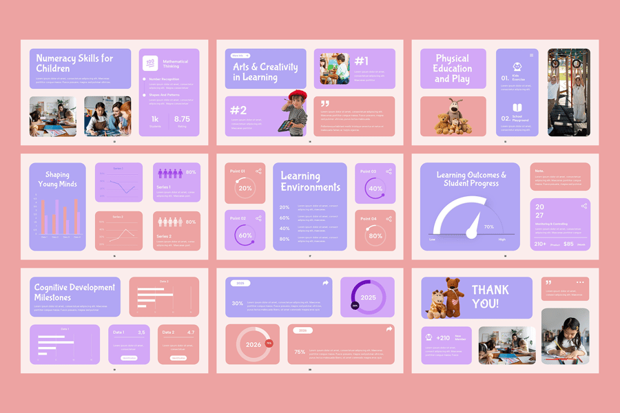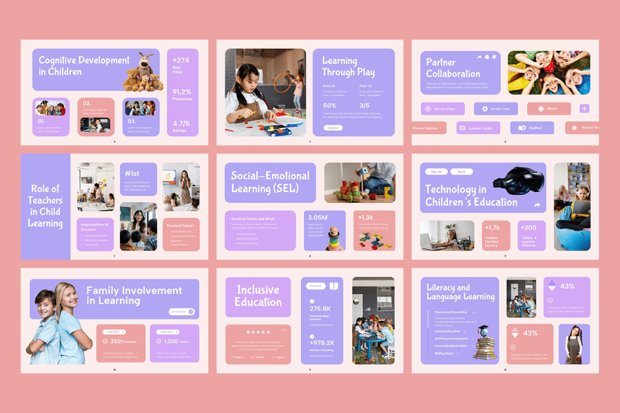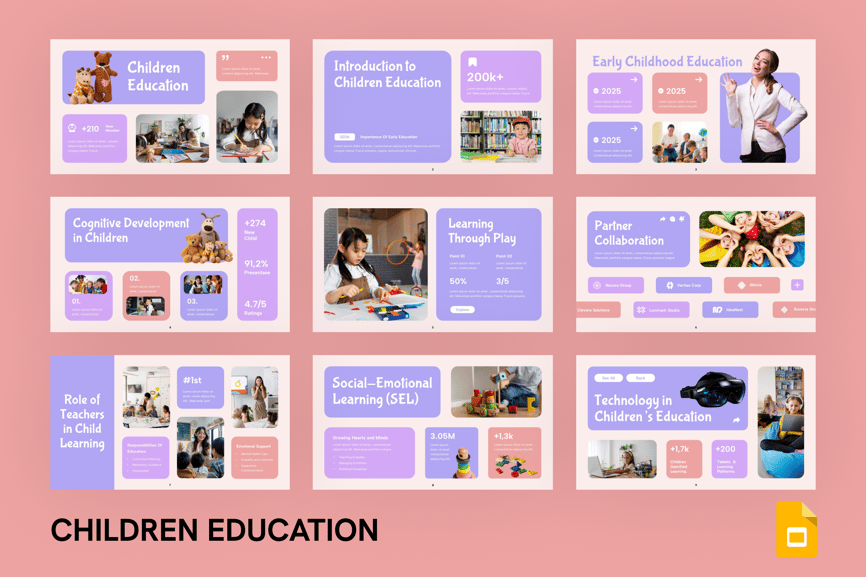 使用儿童教育谷歌幻灯片演示模板,激发年轻学习者的学习热情,打造引人入胜的课堂体验。此模板专为教师、学校、辅导员、幼儿教育工作者、学习中心和学术项目创建者设计。它提供简洁明快、结构清晰的布局,用于展示关键的教育要素,例如课程计划、学习目标、课堂活动、学生进步、课程亮点、行为指导、评估方法以及家长沟通材料。