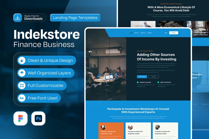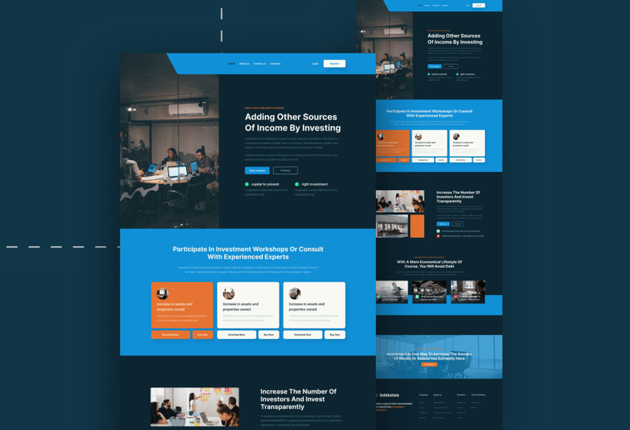 这是我们的新产品 Indesktore – 投资组合网站。这是一个单页着陆页设计,方便您了解 Indesktore – 投资产品。由于采用了矢量图形和清晰的图层结构,草稿易于编辑、自定义和调整大小。