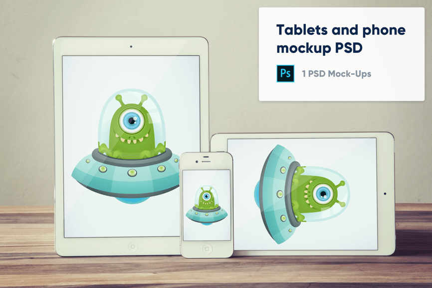 1 逼真的平板电脑和手机在木质背景上的模型 PSD 正面视图,基于真实照片,适用于您的网站、图形演示和品牌推广,需要 Adobe Photoshop CS5+。