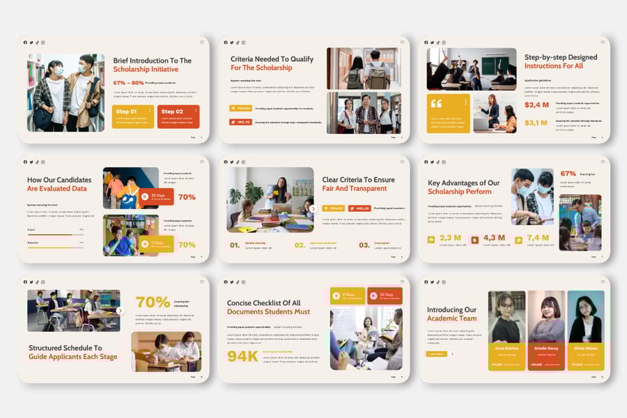这款高级模板融合了现代设计、简洁布局和精心设计的视觉层级,助您清晰自信地传达信息。无论您是申请资金、展示申请结果、阐述奖学金评定标准,还是指导学生如何获得奖学金,这款模板都能以引人入胜的视觉效果,为您呈现目标明确、条理清晰的故事。