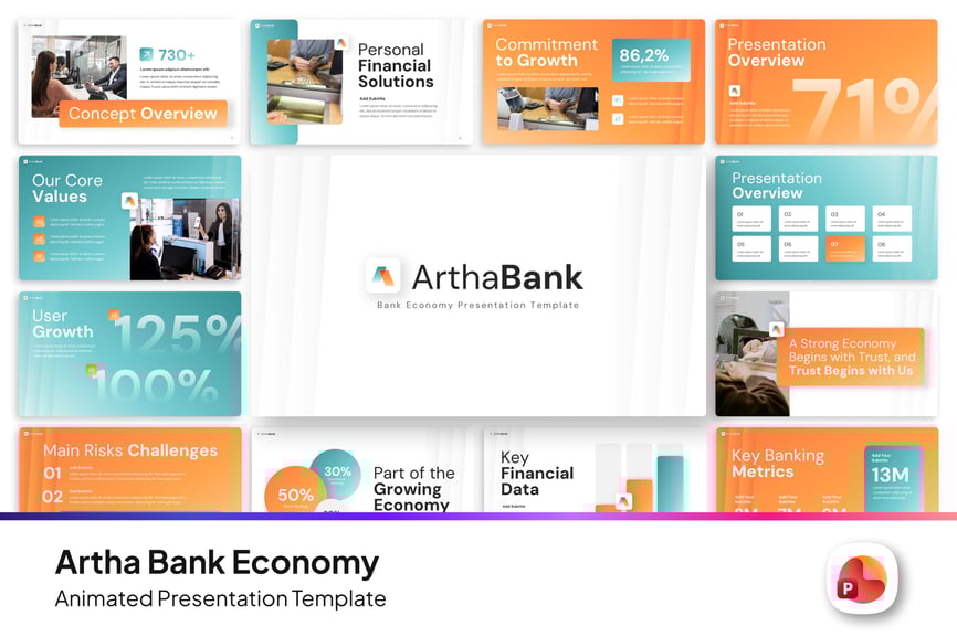 Artha Bank 经济演示文稿是一款以经济和银行业为主题的演示文稿模板,专为金融机构设计。该模板适用于银行、金融分析师、经济顾问和投资公司,用于展示经济报告、市场分析和财务策略。