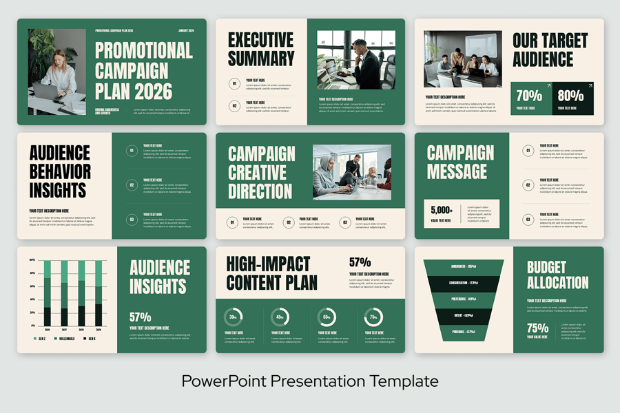 **促销活动计划 PowerPoint 演示模板**旨在帮助团队以清晰有序的方式规划和展示促销活动。它非常适合需要在推出优惠活动前进行结构化规划的营销人员、品牌团队、代理商和企业。