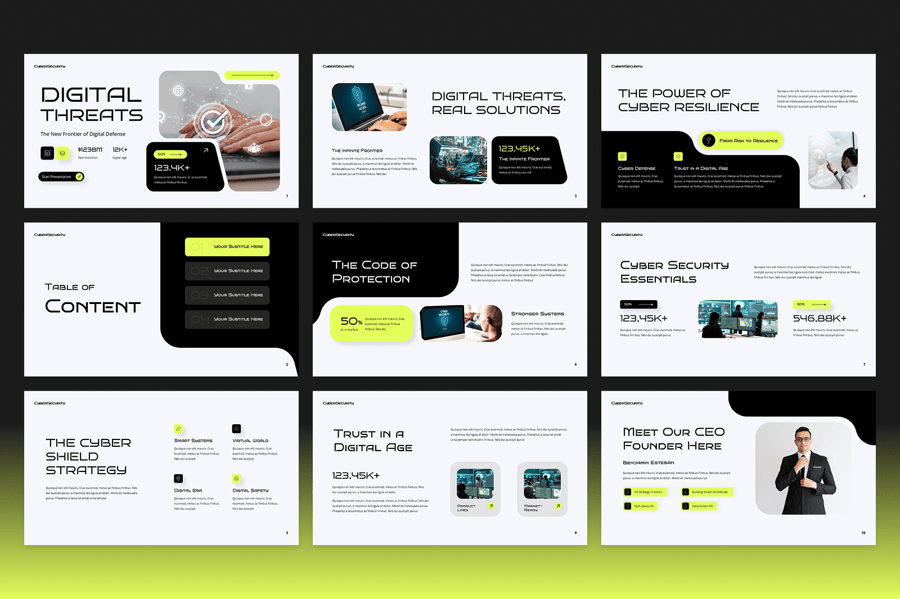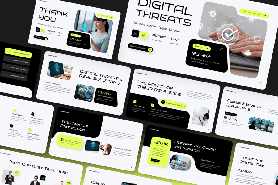 这款产品适用于科技公司和安全公司,是展示新型安全产品、阐述威胁形势和概述数据保护策略的理想之选。无论您是向利益相关者讲解新兴网络风险,还是详细介绍公司创新的安全解决方案,这款演示文稿都能帮助您有效地传达信息。