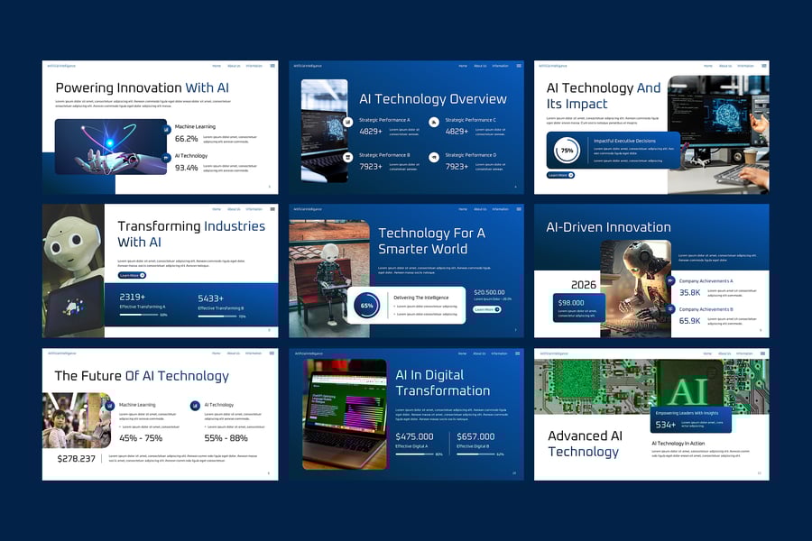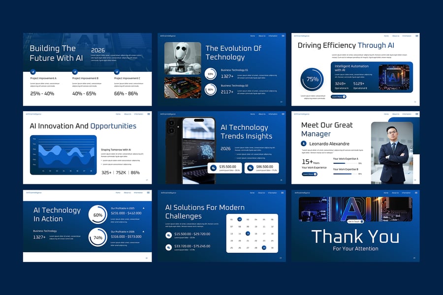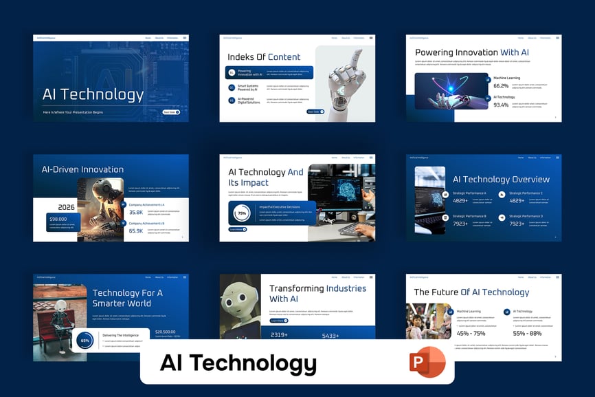 展望未来,清晰阐释科技。这款人工智能技术 PowerPoint 演示模板旨在帮助专业人士以清晰且引人入胜的方式呈现人工智能概念、数字创新和先进技术主题。该模板采用现代科技风格设计,使复杂的概念更易于理解,更具说服力。它适用于有关人工智能解决方案、机器学习、数据科学、自动化、数字化转型和未来技术趋势的演示。简洁的布局、专业的技术可视化效果和结构化的内容模块,帮助您清晰地解释流程、系统和见解,而不会让听众感到不知所措。