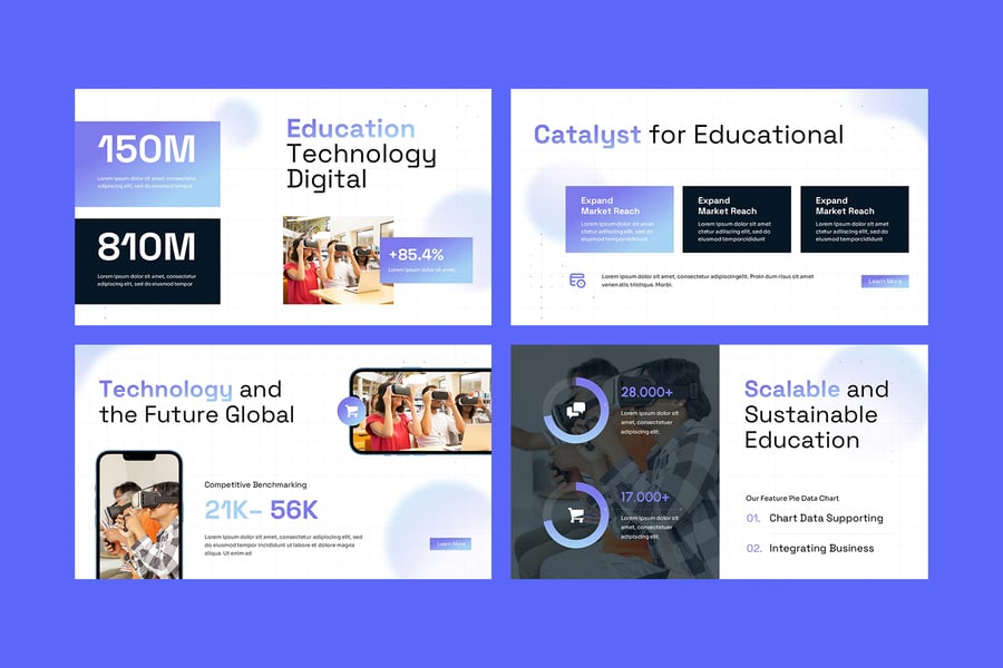 它采用科技感十足的布局、醒目的字体和巧妙的内容结构,帮助您清晰地传达信息——从产品概述、学习分析、课程模块、学生进度报告、平台功能、路线图计划到投资者推介材料。