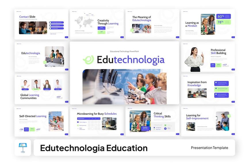 Edutechnologia 采用简洁、现代且科技感十足的设计,以直观易懂的方式呈现学习资料、学习管理系统、学生进度数据和教育内容。非常适合用于教育演示、教育科技产品推介、学习仪表盘和数字教育宣传材料。