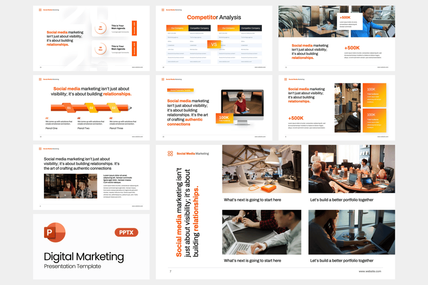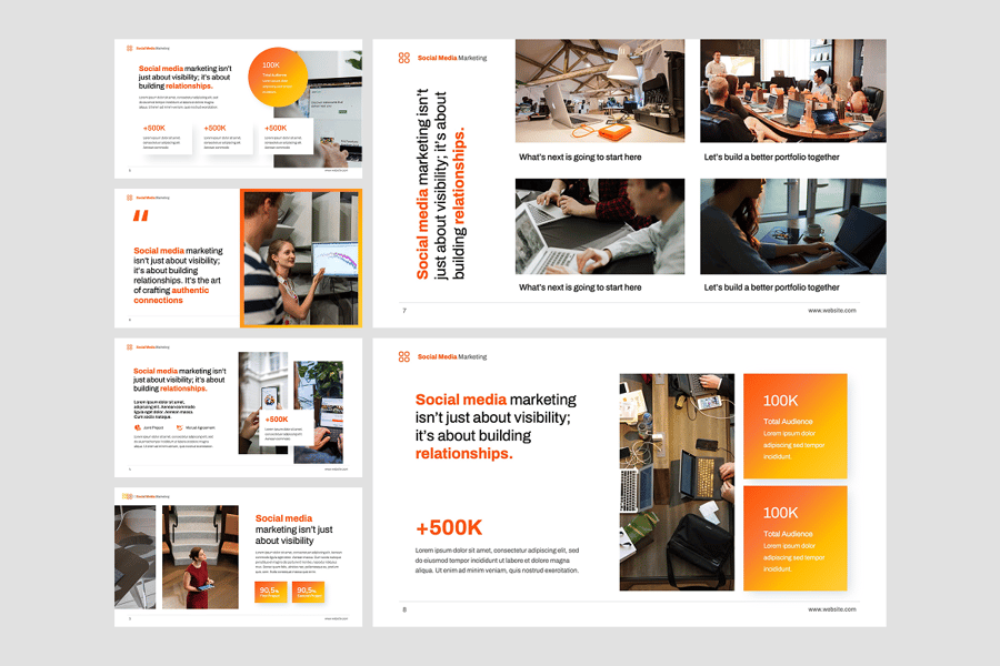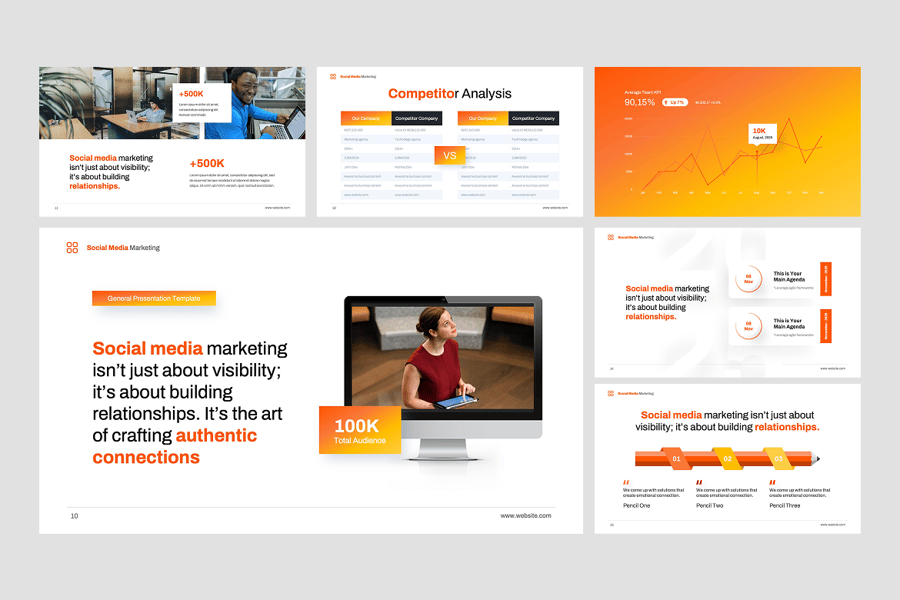 这款社交媒体营销演示模板旨在帮助营销人员、代理商和内容创作者清晰有力地展示他们的数字营销策略。该模板采用现代、简洁且极具视觉吸引力的布局,非常适合用于展示社交媒体营销活动、增长分析、内容计划、受众洞察和绩效报告。