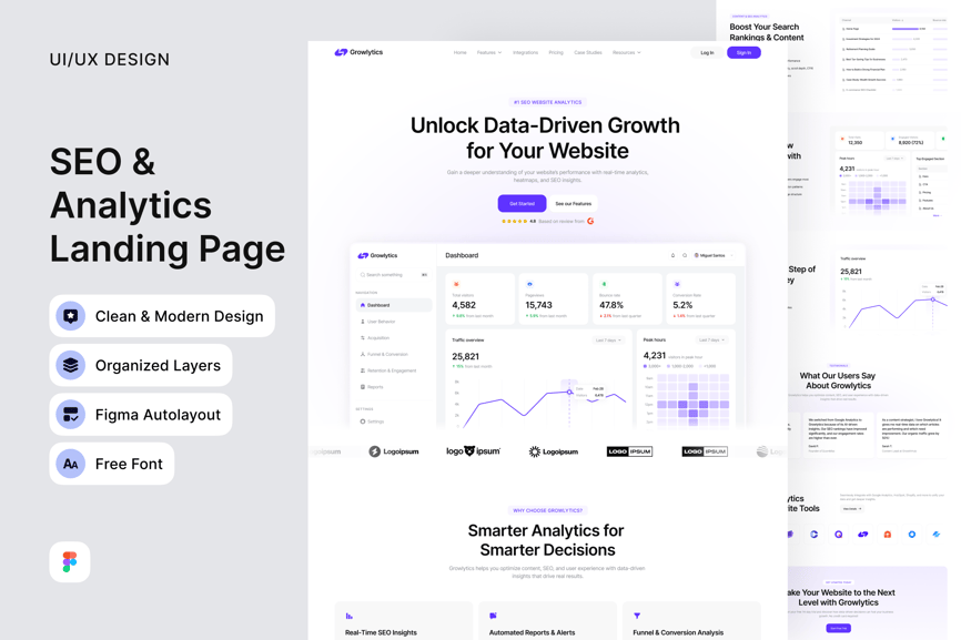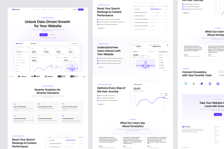 这款**SEO与分析落地页**模板是一款专业设计的用户界面套件,完美适用于SaaS平台、SEO工具、营销仪表盘和数据分析初创公司。这款高转化率的布局能够以清晰、引人入胜的方式展示关键产品洞察、报告和功能,从而建立信任并提升注册量。