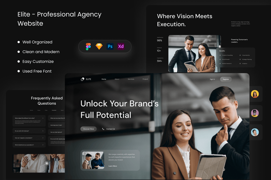 *精英版 – 专业机构网站* 此模板简洁而不失专业现代感。您可以使用 Figma、Adobe XD、Sketch 和 Adobe Photoshop 进行编辑。轻松插入内容、更改颜色,所有模板均已包含在内,可直接与您的受众分享。所有组件均基于矢量图,完全兼容、可编辑且像素级精准。此外,它们组织有序、命名清晰、分组合理。