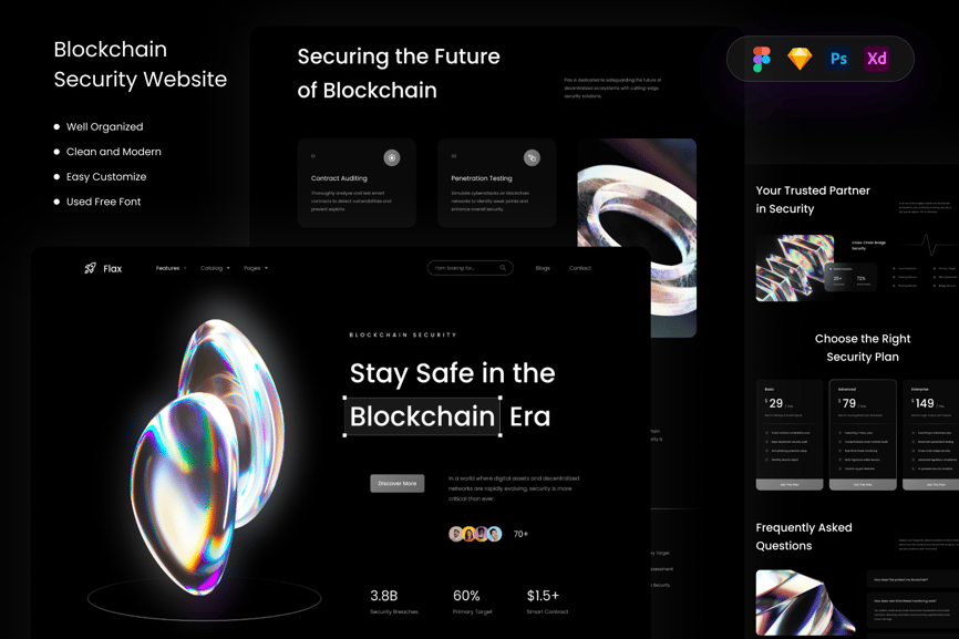 *Flax – 区块链安全网站* 此模板简洁却不失专业现代感。您可以使用 Figma、Adobe XD、Sketch 和 Adobe Photoshop 进行编辑。轻松插入内容、更改颜色,所有模板均已包含在内,可直接与您的受众分享。所有组件均基于矢量图形,完全兼容、可编辑且像素级精准。此外,它们组织有序、命名清晰、分组合理。