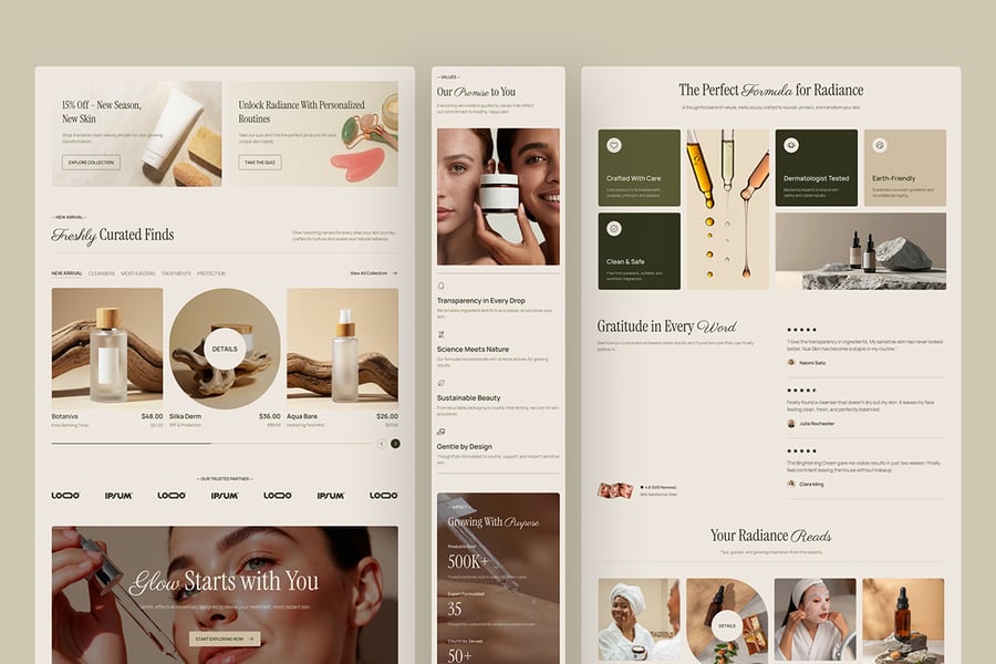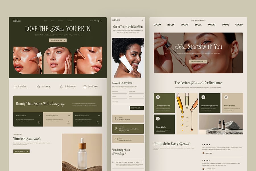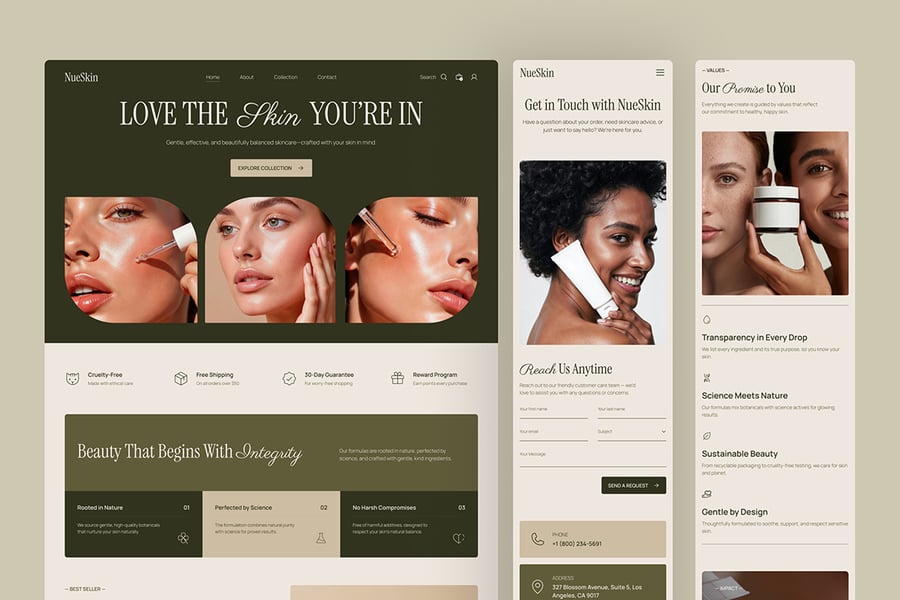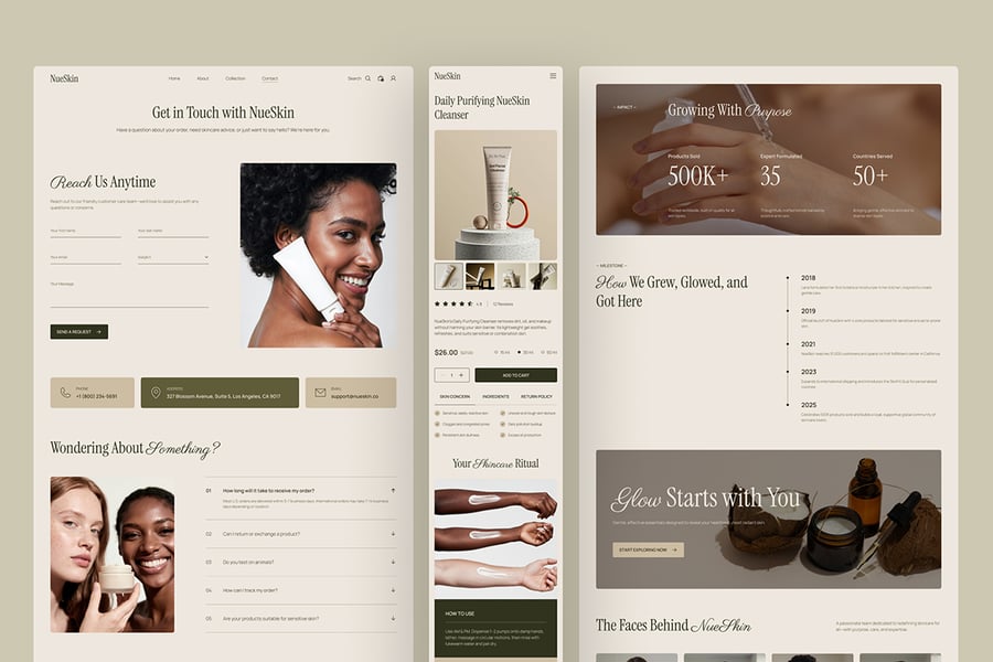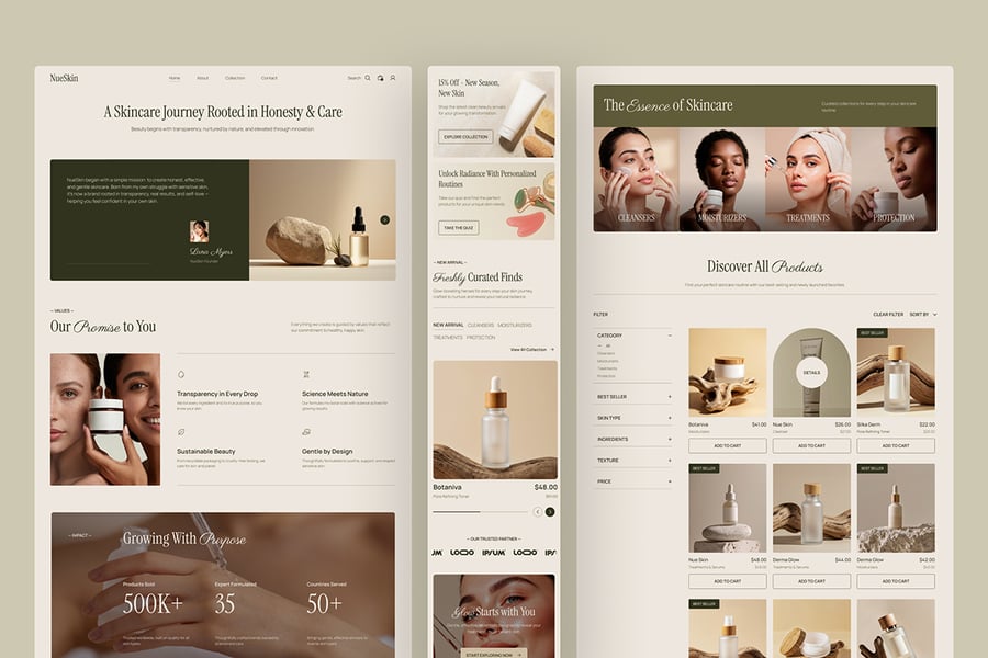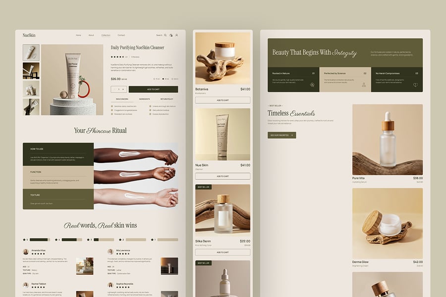 NueSkin采用柔和的奢华电商系统,以温暖的中性色调、大地色系点缀和杂志式的构图,使产品感觉高端且值得信赖: