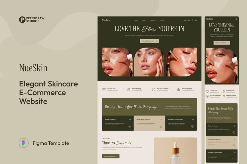 NueSkin 也非常适合用于 UI 和 UX 设计探索。其布局采用一致的间距、平衡的字体层级和模块化的内容部分,可实现快速自定义,非常适合构建真实的店铺页面、展示客户概念、创建美妆品牌演示或以高端美学润色作品集案例研究。