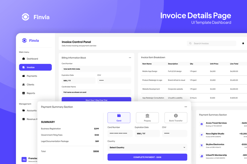隆重推出 Finvia,一款现代化的发票详情页面,旨在简化账单透明度和财务跟踪。Finvia 完美适用于 SaaS 平台、会计系统和业务管理工具,其结构清晰、易于阅读的布局,在一个简洁高效的界面中展示发票摘要、付款状态、交易明细、客户信息和可下载记录。