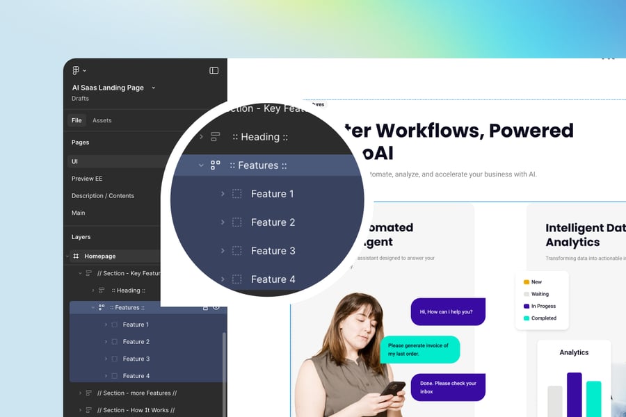 软件准备就绪后,将“LUMO.fig”文件导入Figma。导入后,您会在右侧面板看到一个组织有序、分组清晰的文件夹,方便您轻松浏览。编辑操作也十分便捷——只需点击相应的文件夹,选择要修改的图层,即可进行更改。就是这么简单。