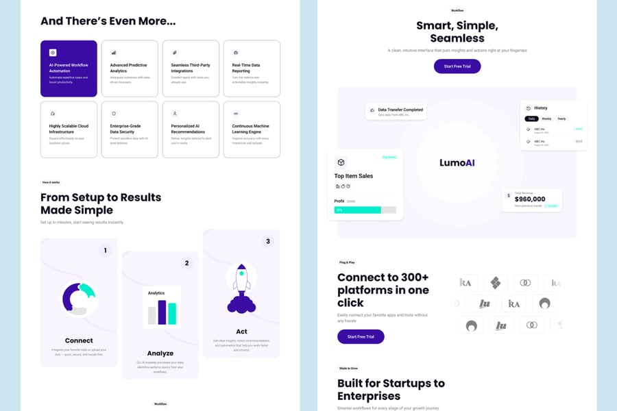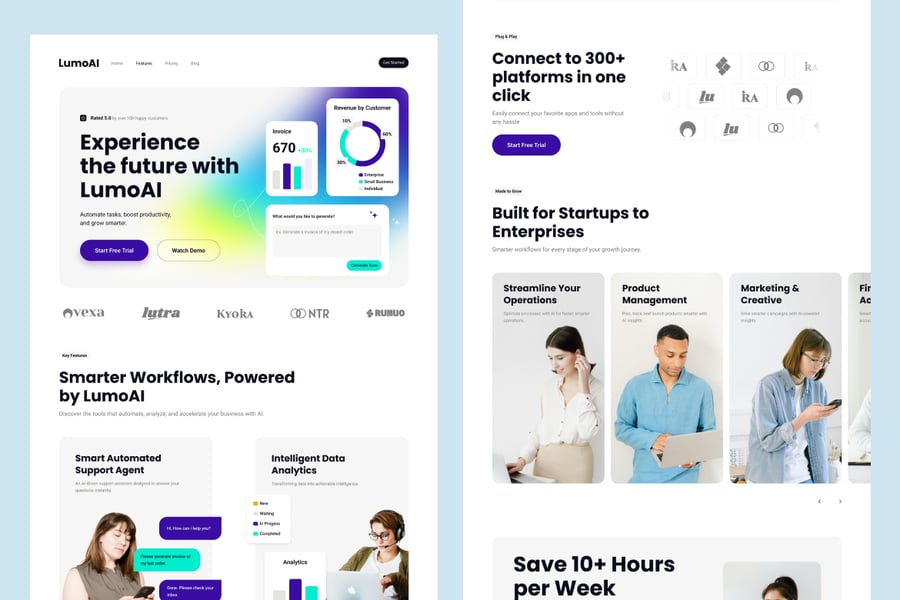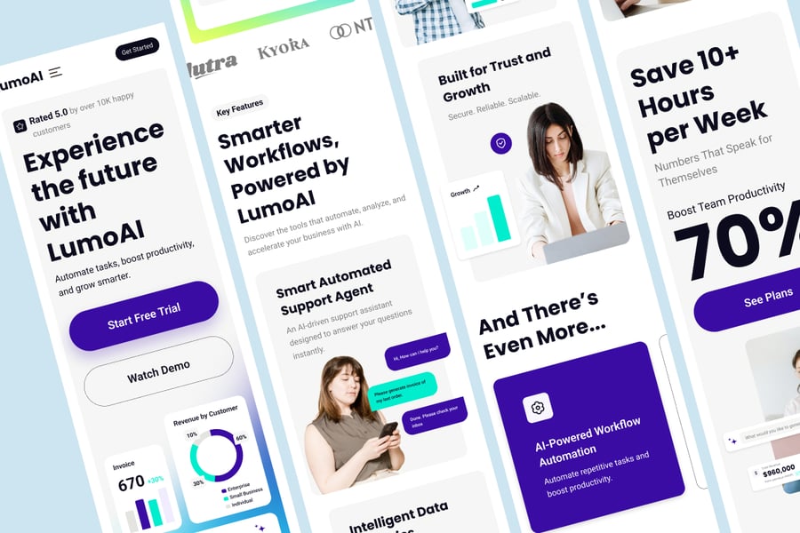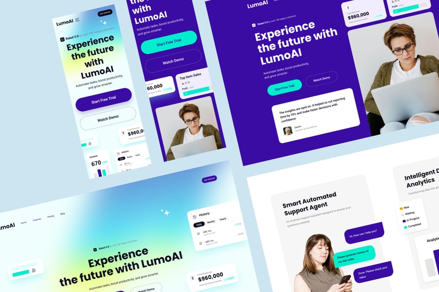 LumoAI 提供 3 种独特的首页横幅样式,让您的 AI 产品给人留下完美的第一印象。非常适合初创公司、SaaS 创始人、UI 设计师和产品团队。