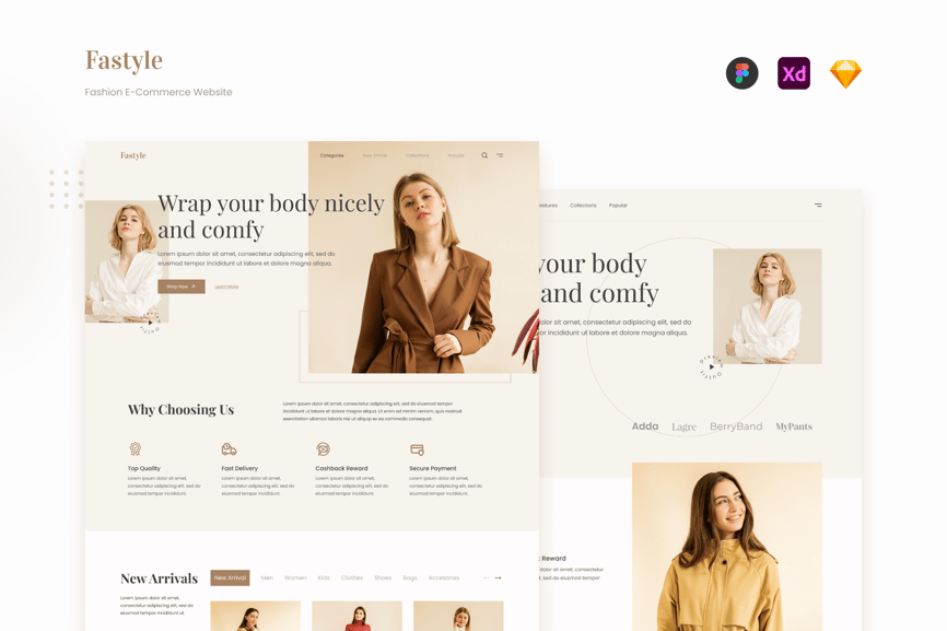 Fastyle 是一款简洁优雅的时尚电商网站模板,提供两种不同的文件格式供您选择,以适配您常用的应用程序:XD、Sketch 和 Figma 格式文件。您可以使用 Adobe XD、Sketch 或 Figma 编辑模板中的文本、图像和颜色,根据个人喜好或品牌形象进行调整。