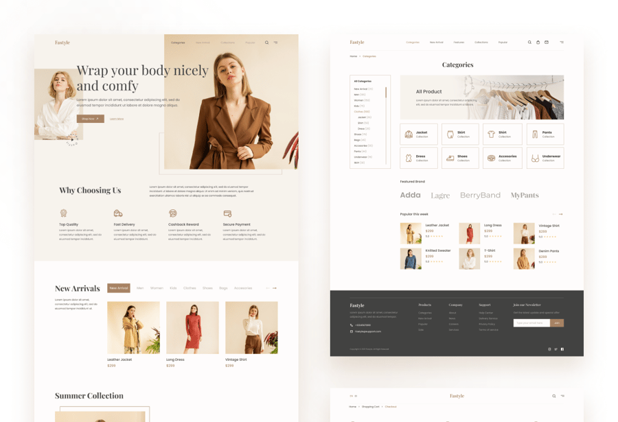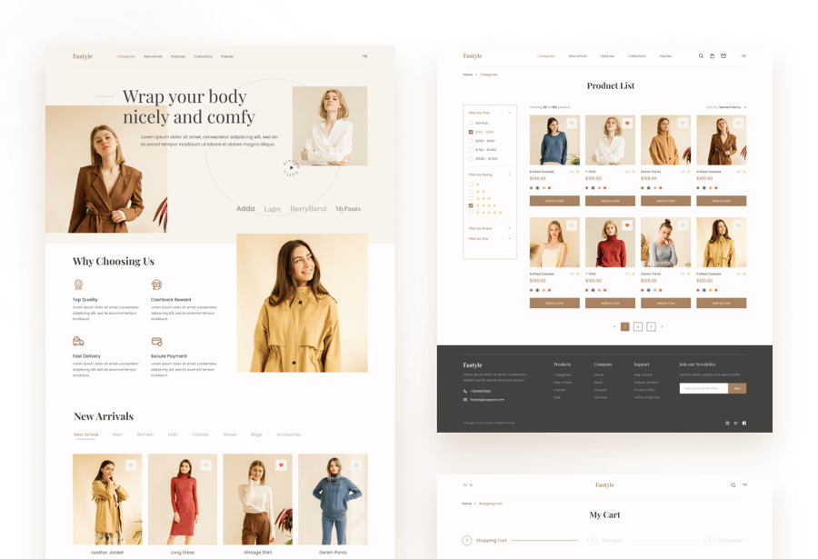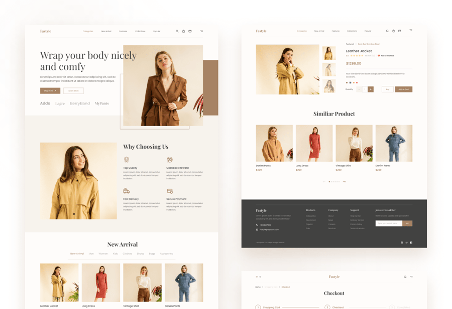 这款模板设计简洁,用户界面友好,即使是电商网站新手也能轻松上手。为了方便您的客户,我们提供从首页到结账页面的完整网站模板。使用 Fastyle,让您的电商网站更加出众、引人注目。