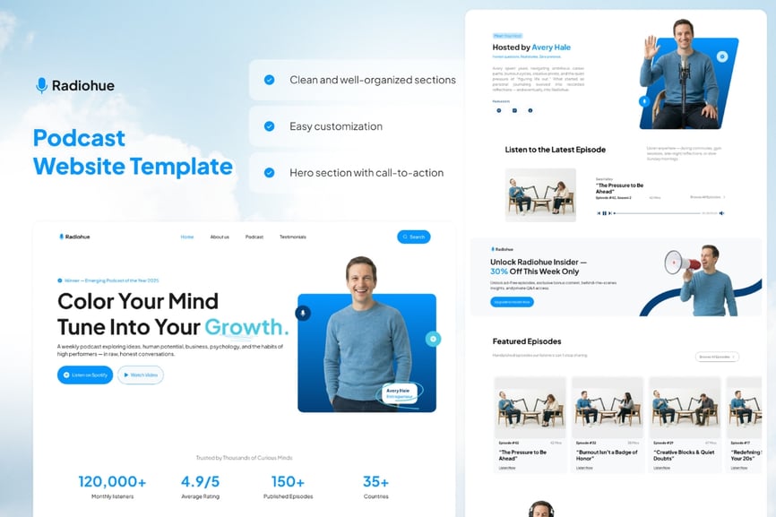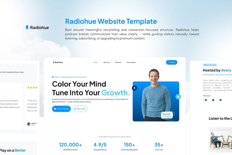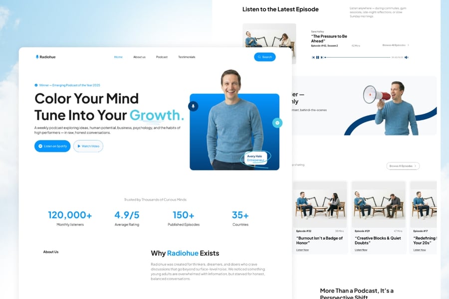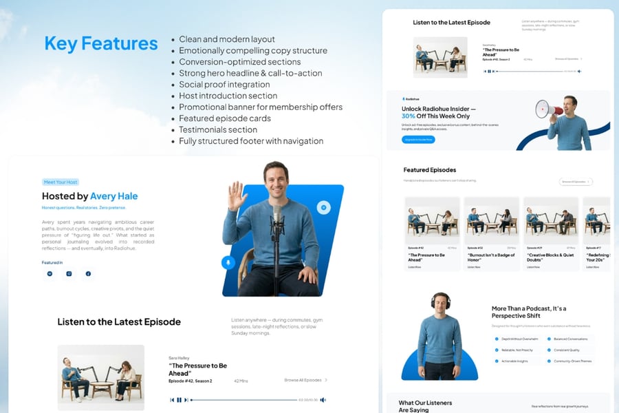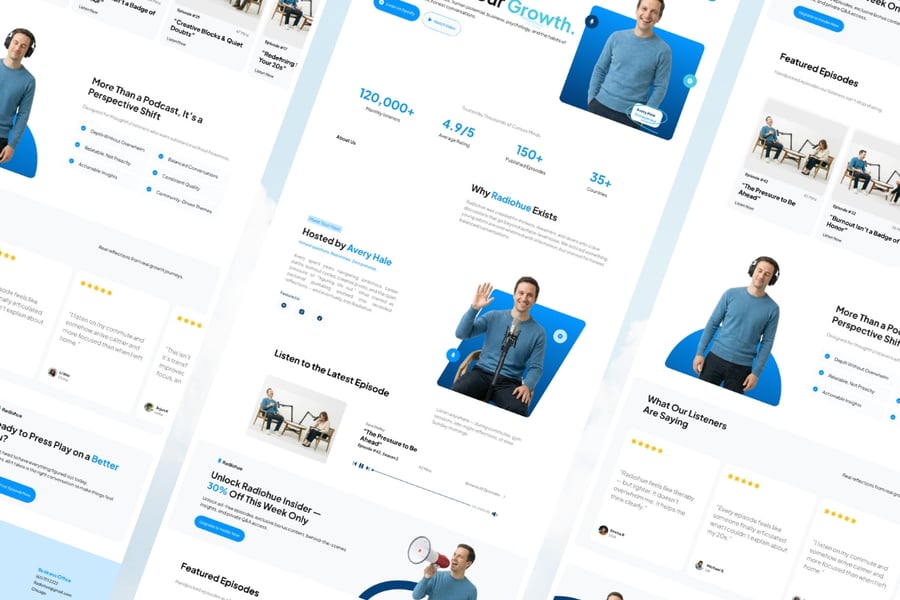 Radiohue 是一款现代化的播客主机登录页面 UI 模板,专为个人创作者、访谈主持人、思想领袖和个人品牌媒体平台而设计。