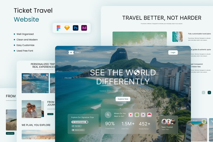 *Pakit – 旅行票务网站* 此模板简洁却不失专业与现代感。您可以使用 Figma、Adobe XD、Sketch 和 Adobe Photoshop 进行编辑。轻松插入内容、更改颜色,所有模板均已包含在内,可直接与您的受众分享。所有组件均基于矢量图形,完全兼容、可编辑且像素级精准。此外,它们组织有序、命名清晰、分组合理。