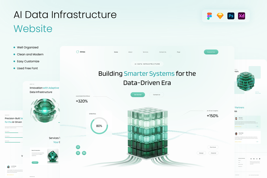 **Orinex – AI 数据基础设施网站** 此模板简洁却不失专业现代感。您可以使用 Figma、Adobe XD、Sketch 和 Adobe Photoshop 进行编辑。轻松插入内容、更改颜色,所有模板均已包含在内,可直接与您的受众分享。所有组件均基于矢量图形,完全兼容、可编辑且像素级精准。此外,它们组织有序、命名清晰、分组合理。