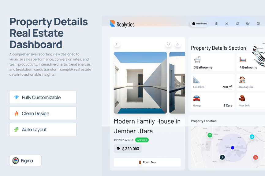 Realytics 是一款简洁、现代的房地产详情仪表盘,拥有高质量的界面。Realytics 易于定制,可满足您的各种需求。它提供浅色模式,并可在 Figma 中轻松使用。