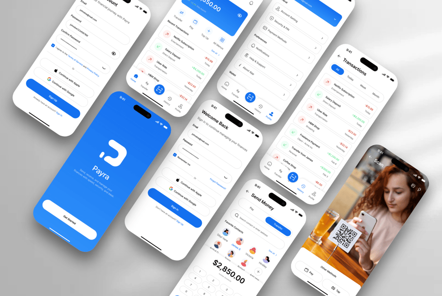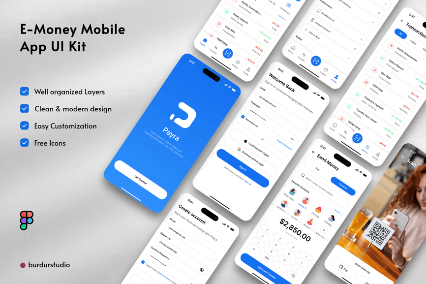 **电子货币移动应用UI套件** 易于定制,可完美满足您的移动登录需求。您可以使用Figma进行编辑。轻松插入内容、更改颜色,所有模板均已包含在内,可直接与您的用户分享。完全兼容、可编辑且像素级精准。此外,所有模板都经过精心组织、命名和分组。