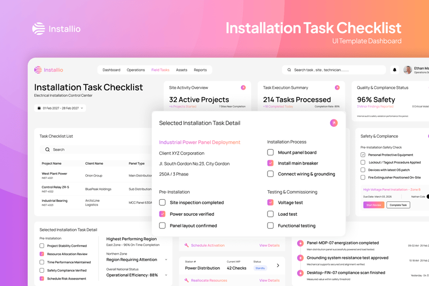 Installio 是一款现代化的安装任务清单仪表盘,旨在简化项目协调和现场服务管理。Installio 界面简洁清晰,结构化的设计使其非常适合技术人员、承包商和服务公司使用,能够帮助团队跟踪安装进度、管理任务清单、监控截止日期,并确保每项工作都能高效、按时完成。