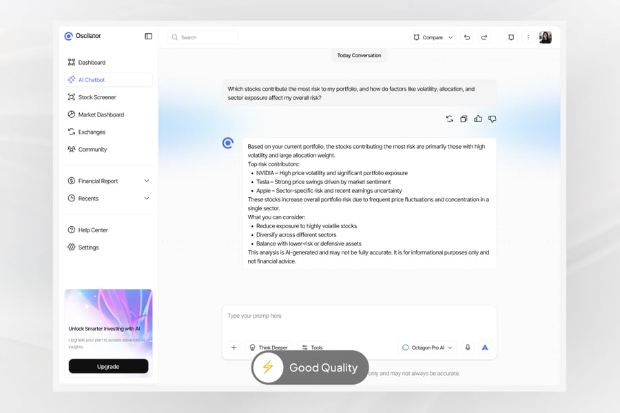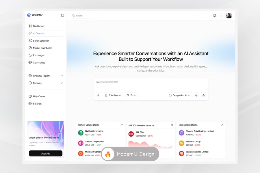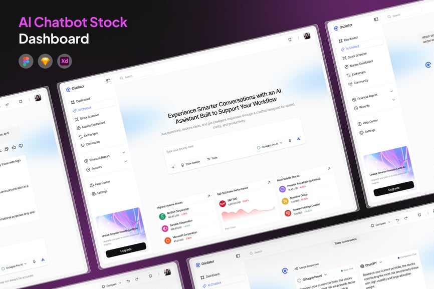 AI聊天机器人股票仪表盘是一个现代化的界面概念,旨在将人工智能与股票市场分析相结合,打造一个强大的平台。该仪表盘使用户能够监控股票表现、市场趋势和投资洞察,同时还能与AI驱动的聊天机器人助手进行互动。简洁明了的布局帮助用户轻松浏览财务数据、追踪投资组合表现,并根据实时市场分析获取智能建议。