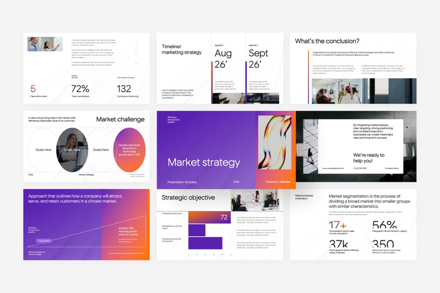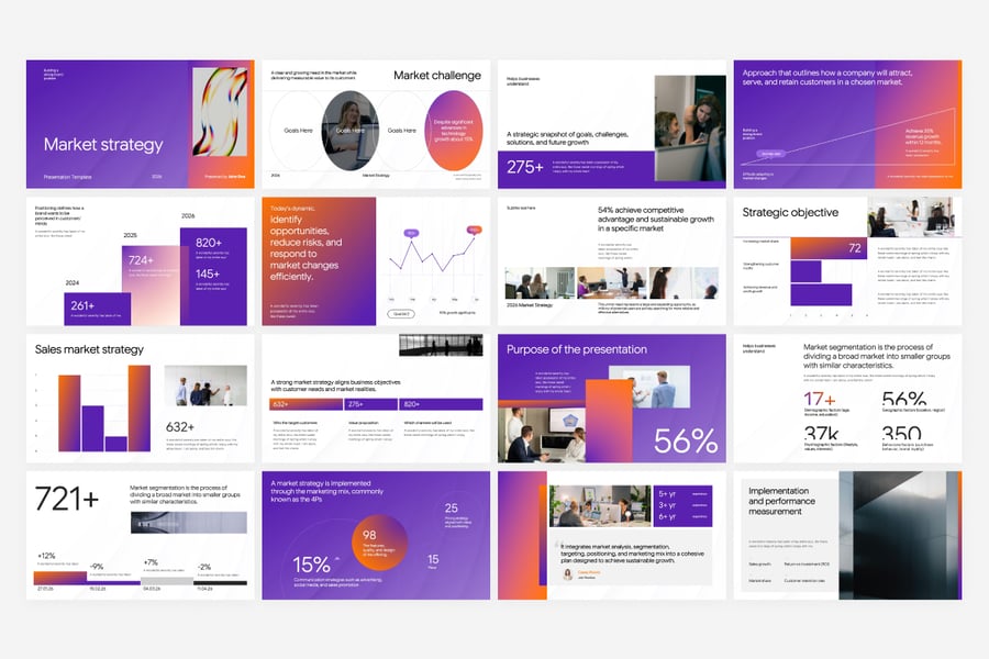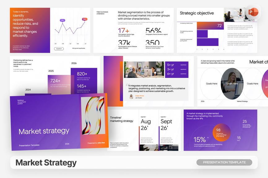 **适用范围:**市场进入计划演示、目标市场演示、营销活动策划演示、季度营销策略演示、市场拓展演示、合作伙伴关系演示、业务拓展演示、产品发布演示、风险投资演示、战略分析师演示