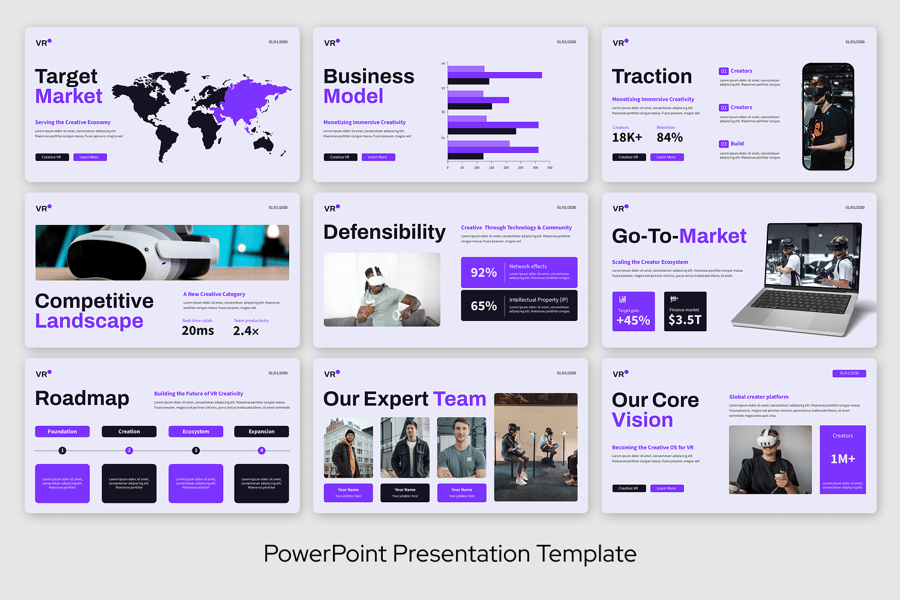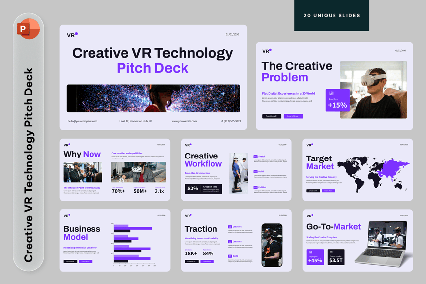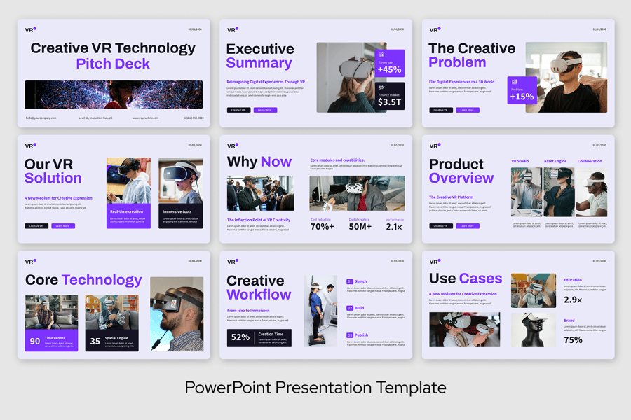 这款**创意VR技术演示文稿模板**旨在以清晰且引人入胜的方式呈现虚拟现实技术概念。它非常适合科技初创公司、创意工作室、开发人员和创新团队用来介绍沉浸式解决方案。