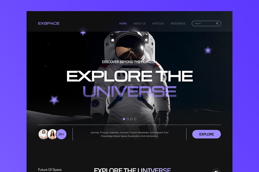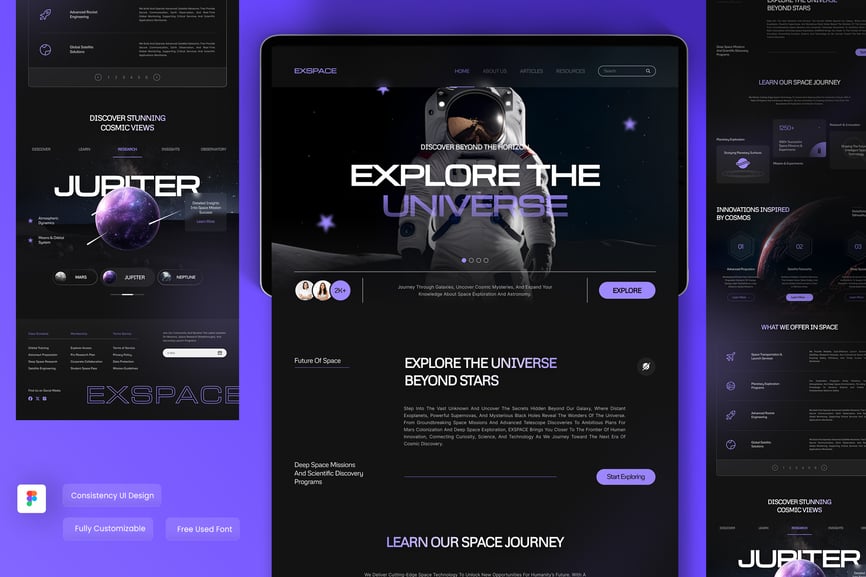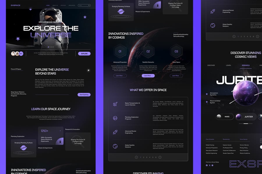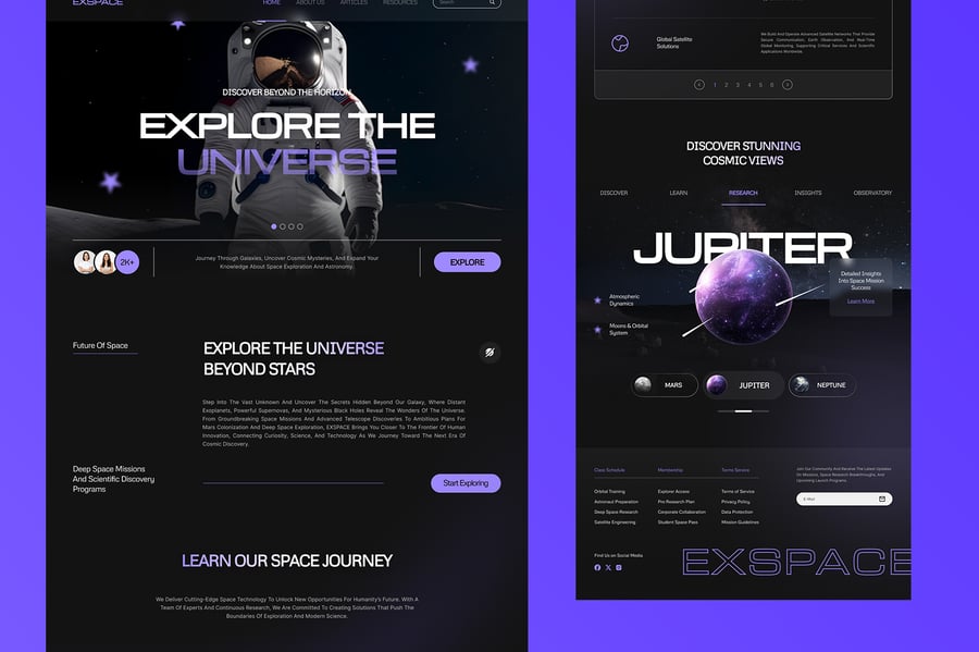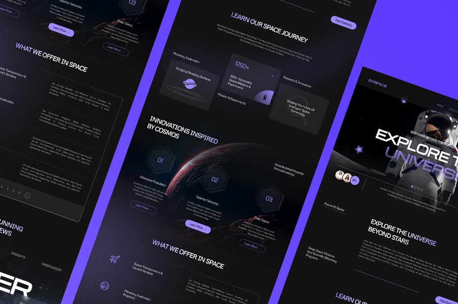 探索专为引人入胜的太空探索和天文平台而设计的“EXSPACE”网站 UI 套件。这套全面的资源包助力创作者为科学研究、行星探测和未来任务计划打造引人入胜的用户体验。借助专业打造的界面,激发探索精神,提升您的项目品质。