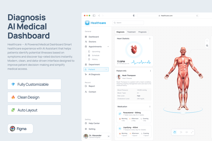Haltycare 是一款基于人工智能的诊断页面医疗仪表盘,设计简洁现代,屏幕显示效果出色。Haltycare 易于定制,可根据您的需求进行全面调整。它提供浅色模式,并可在 Figma 中轻松使用。