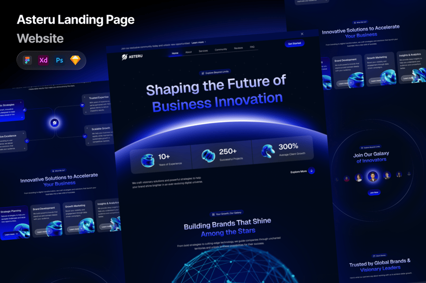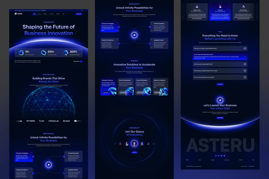 使用 **Asteru** 加速您的业务发展。Asteru 是一款大胆而现代的落地页模板,专为代理机构、初创公司和专业服务提供商设计。凭借其未来感十足的视觉效果、简洁的字体和结构化的内容版块,Asteru 可帮助您突出专业技能、展示服务并建立客户信任。