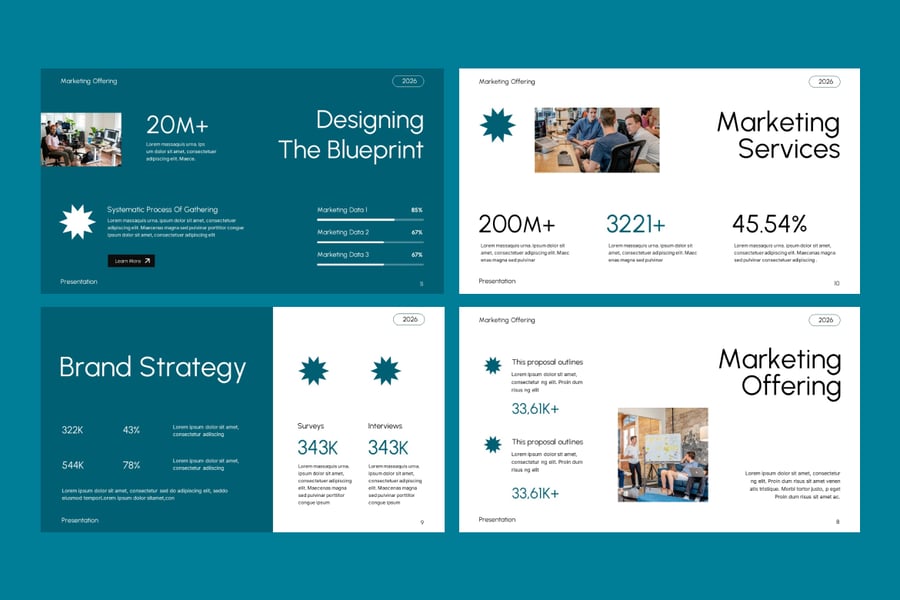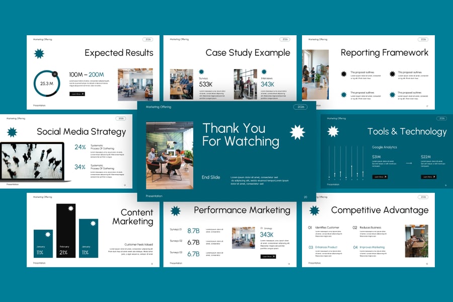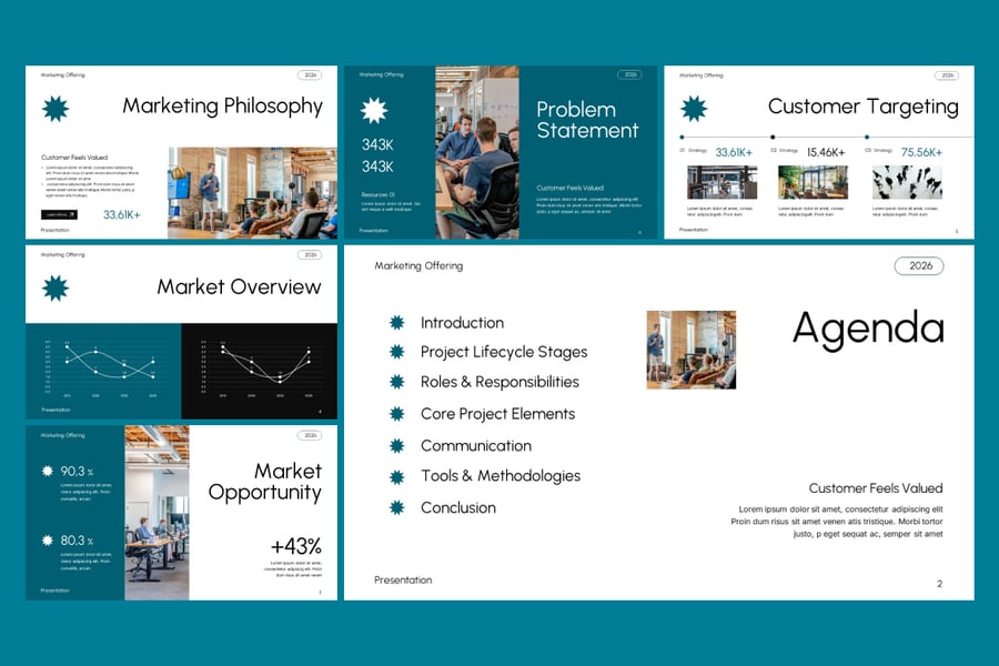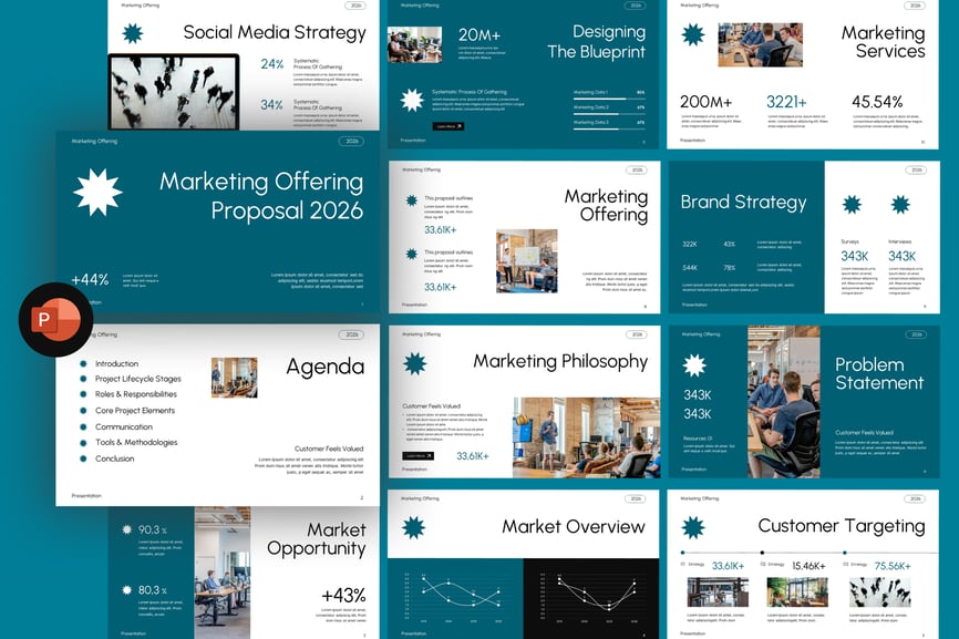 此模板可在 Microsoft PowerPoint 中完全编辑,您可以轻松自定义文本、图像、颜色、图表和信息图元素,以匹配您的品牌标识或营销风格。无论您是展示数字营销方案、代理服务、营销活动策略还是营销咨询计划,此模板都能帮助您呈现引人入胜且专业的演示文稿。它非常适合用于营销方案、代理机构提案演示、数字营销策略、咨询演示和客户商务会议。