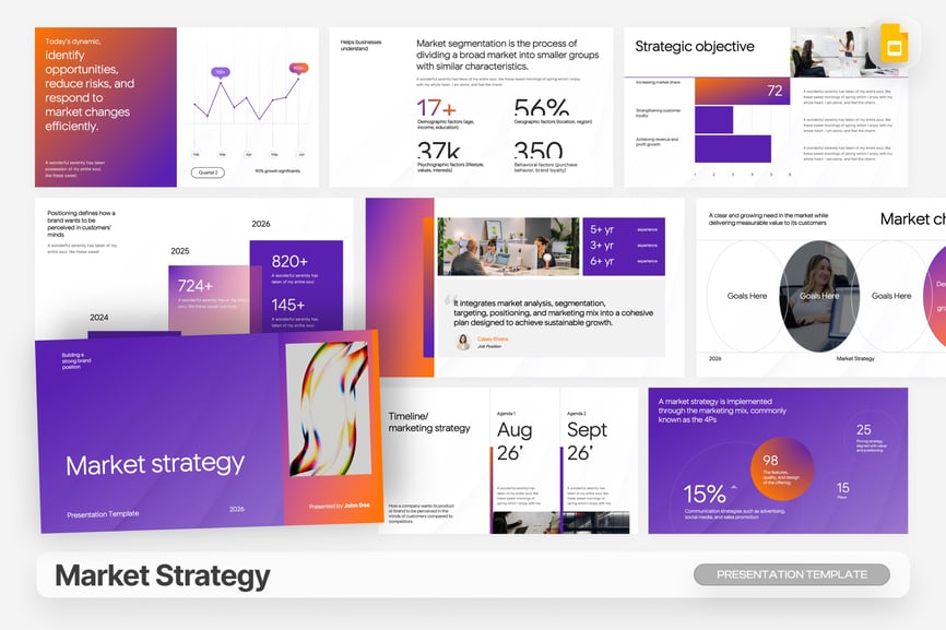 **适用范围:**市场进入计划演示、目标市场演示、营销活动策划演示、季度营销策略演示、市场拓展演示、合作伙伴关系演示、业务拓展演示、产品发布演示、风险投资演示、战略分析师演示
