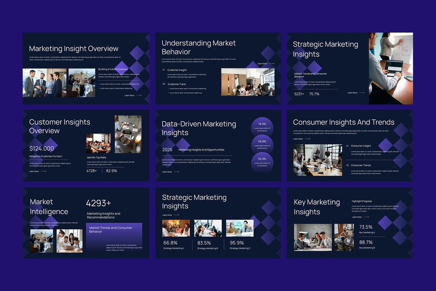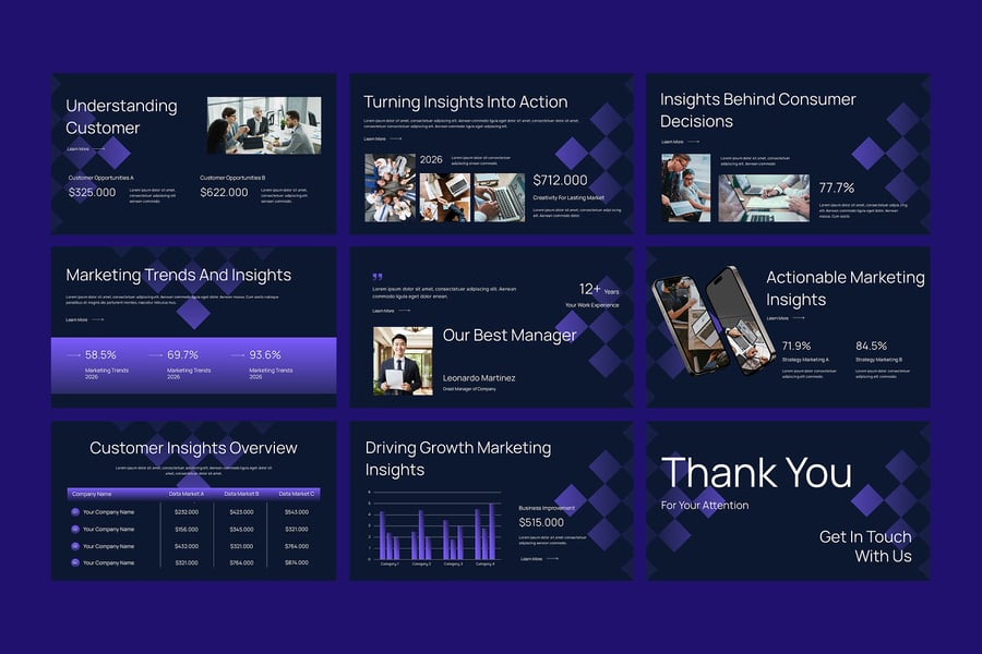 将数据转化为可执行的营销决策,“营销洞察”PowerPoint演示模板是一款现代专业的幻灯片模板,专为需要清晰有力地展示营销数据、洞察和绩效的营销人员、分析师、顾问和业务团队而设计。该模板有助于将复杂的营销指标转化为易于理解的可视化图表。它包含结构化的布局,涵盖营销活动分析、客户洞察、市场趋势、渠道绩效、关键绩效指标 (KPI)、转化率分析和战略建议。简洁明了且以数据为导向的设计,让您的观众专注于真正重要的洞察。
