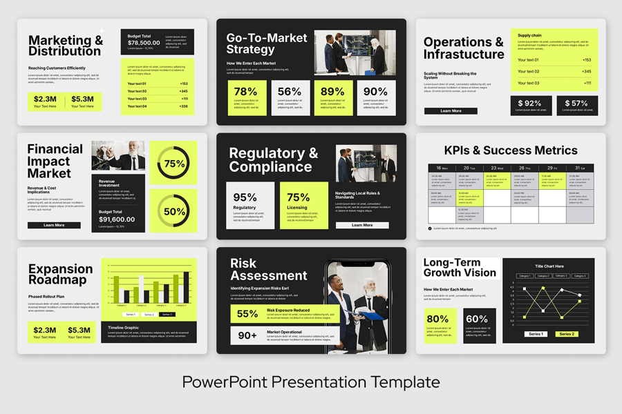 这套演示文稿着重于如何以结构化和自信的方式规划业务扩张。内容涵盖市场调研、目标区域分析、客户细分、竞争格局、进入策略、定价策略、分销渠道、合作机会、风险评估、财务预测、推广时间表和增长里程碑。它适用于高管简报、投资者讨论、业务发展规划和内部战略审查。