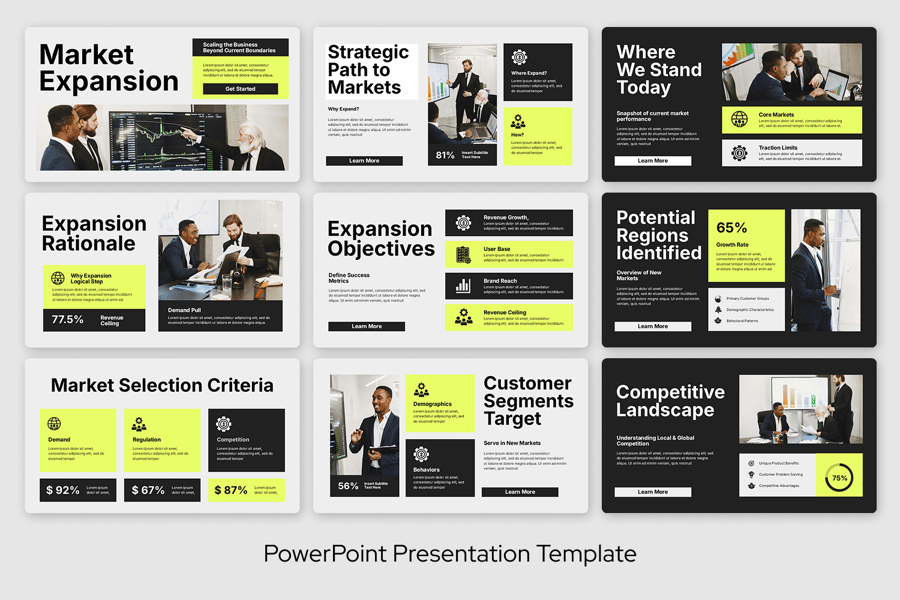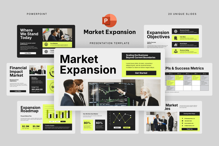 **市场拓展 PowerPoint 演示模板**旨在帮助团队以清晰且具有战略性的方式展示增长计划。它非常适合正在探索新地区、进军新市场或扩大现有业务规模的企业。