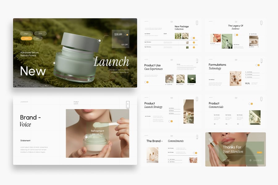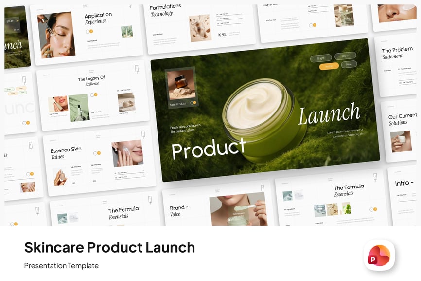 护肤品产品发布 PowerPoint 是一款专业的演示模板,旨在以优雅而有说服力的方式介绍和推广护肤品,适用于品牌发布会、向分销商推介、向投资者演示、营销活动计划和美容展示活动。