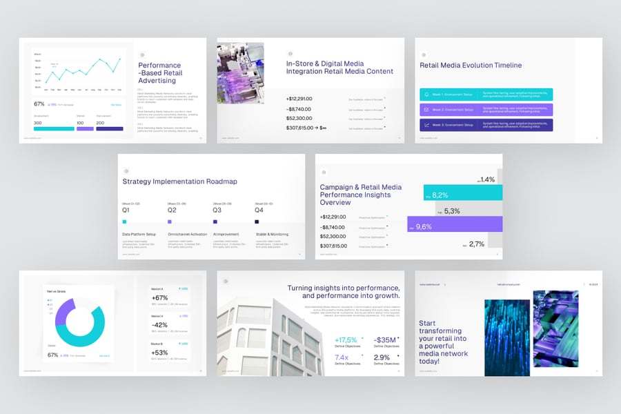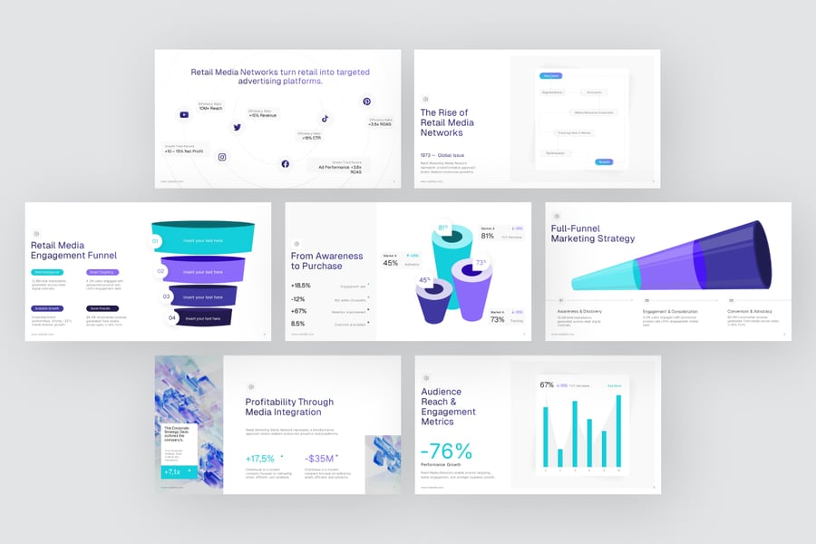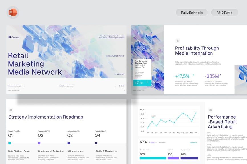 这款产品非常适合营销团队、电商企业、媒体平台和零售品牌用于展示广告策略、营收增长计划和数字营销绩效。简洁现代的设计,结合信息图表元素和清晰的数据可视化,使其成为投资者路演、营销报告、商业计划书和零售媒体策略演示的理想之选。