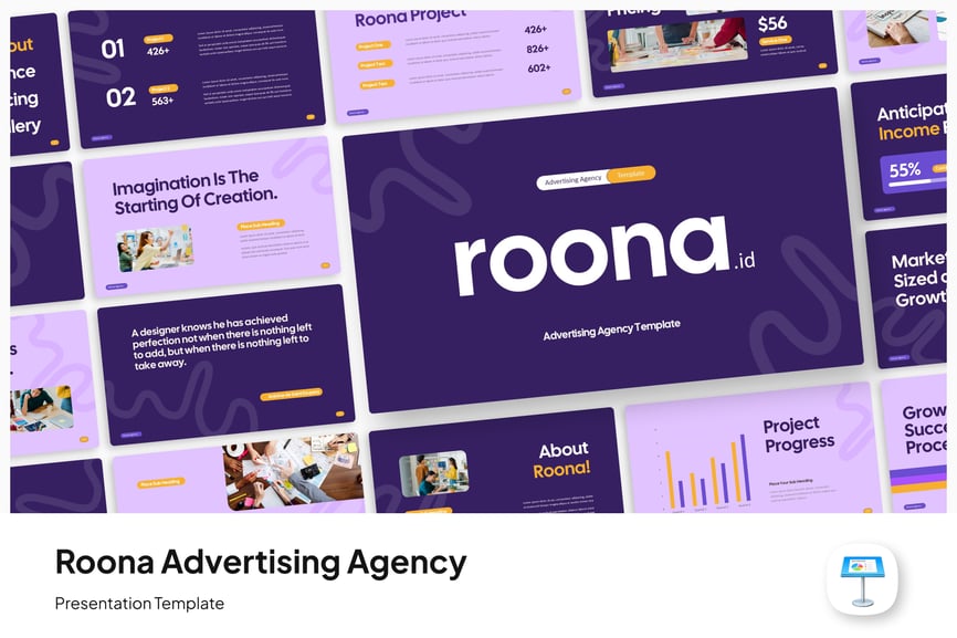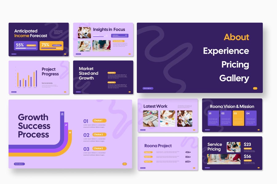 这款模板采用现代动感的设计,布局结构清晰,字体简洁醒目,视觉效果强烈,能够突出创意理念。它包含公司简介、代理服务、市场分析、目标受众、营销活动概念、项目时间表、预算以及绩效和关键绩效指标 (KPI) 图表等幻灯片。该模板易于定制,有助于在每次演示中树立专业、创新和值得信赖的形象。