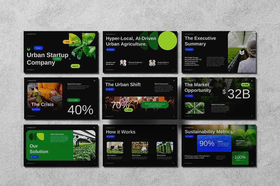 农业演示模板旨在帮助农业企业团队、研究人员和利益相关者清晰自信地展示农业策略、作物表现和创新举措。它能帮助您传达数据驱动的洞见,从而支持更明智的农业决策。从农场运营和供应链规划到可持续发展项目和市场机遇,每个部分都能帮助您将信息构建成引人入胜且专业的叙述。无论您是向投资者推介、向合作伙伴汇报,还是展示发展项目,此模板都能帮助您将农业数据转化为可执行的策略。