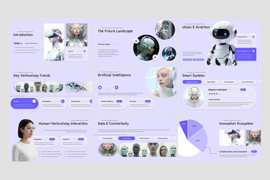 该模板专为专业人士、创新者和具有前瞻性思维的团队而设计,非常适合希望以现代且有影响力的方式展示人工智能概念的科技公司、初创企业、数字机构、顾问、教育工作者和研究人员。