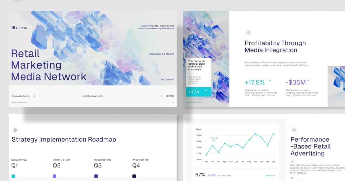 广告公司 PowerPoint 是一款专业的演示模板,专为广告公司设计,用于向客户和利益相关者传达创意策略、活动方案和绩效报告。它适用于项目提案、品牌战略演示、社交媒体营销活动和数字营销报告。