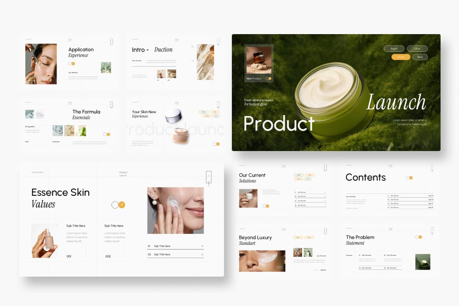 这款模板采用简洁、柔和的高级设计,以柔和的粉彩色调或裸色为主,体现了美容和护肤的理念。它包含品牌故事、产品亮点、主要成分、产品功效、使用前后对比图、目标市场分析、营销策略以及定价和分销计划等幻灯片。该模板易于定制,能够以美观、可信且引人注目的方式展现产品价值。