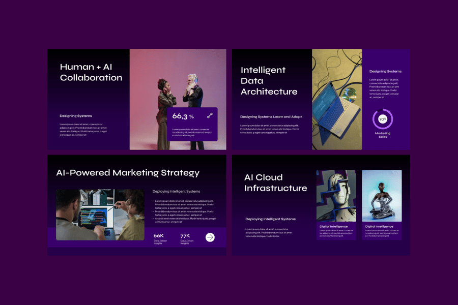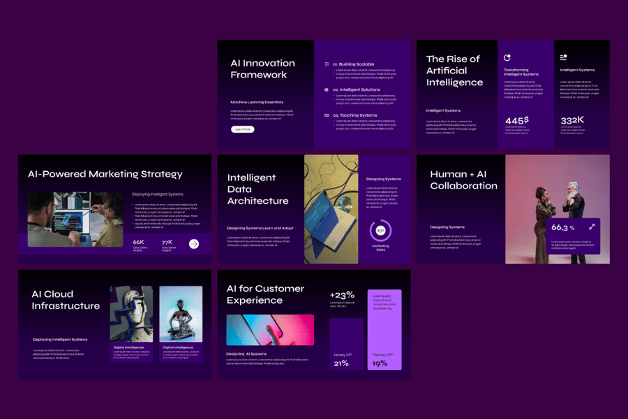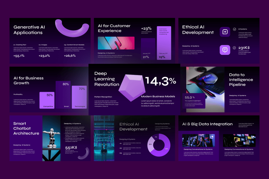 这款专为初创公司、科技公司、IT顾问、数据科学家和创新型企业设计的AI技术PowerPoint演示模板,将助您提升商务演示效果。该模板采用现代未来主义设计,完美适用于展示人工智能项目、机器学习策略、自动化系统、大数据分析、数字化转型和新兴技术。这款专业的PowerPoint模板拥有简洁的布局、醒目的字体、高科技渐变效果和动态信息图表,助您打造极具影响力的演示。无论您是向投资者进行路演、展示AI解决方案,还是讲解深度学习模型,这款模板都能确保您的内容清晰、可信且前沿。